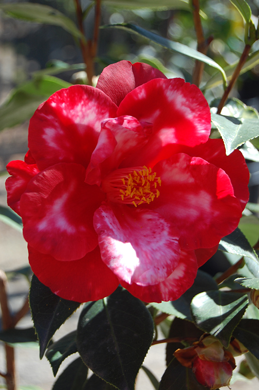 Lustrous deep green foliage covers this vigorous, upright shrub; large-sized, semi-double, velvety red blooms with white markings open in winter; provide rich, acidic, moist, well-drained soil