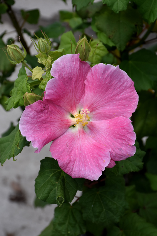 Pink Confederate Rose features bold pink round flowers with gold eyes at the ends of the stems from early summer to mid fall. Its large serrated heart-shaped leaves remain green in colour throughout the season.