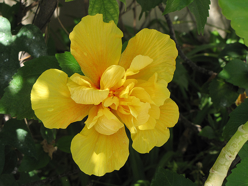 Double Yellow Hibiscus features bold double yellow round flowers with cherry red eyes at the ends of the branches from late spring to early fall. Its glossy pointy leaves remain dark green in colour throughout the year.