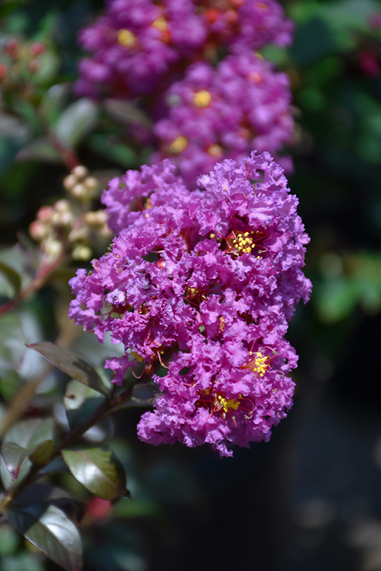 Purple Pop™ Crapemyrtle is smothered in stunning panicles of purple frilly flowers with hot pink overtones at the ends of the branches from early summer to early fall. It has dark green deciduous foliage which emerges brick red in spring. The glossy oval leaves turn red and orange in fall.