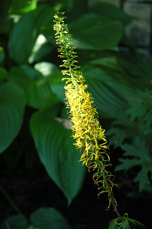 Rayflower features bold spikes of yellow flowers rising above the foliage from late summer to early fall. Its large serrated round leaves remain dark green in colour throughout the season. The deep purple stems are very colorful and add to the overall interest of the plant.