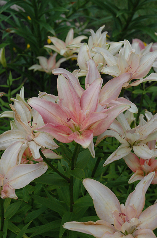 Aphrodite Lily will grow to be about 30 inches tall at maturity, with a spread of 18 inches. When grown in masses or used as a bedding plant, individual plants should be spaced approximately 14 inches apart. It tends to be leggy, with a typical clearance of 1 foot from the ground, and should be underplanted with lower-growing perennials. It grows at a fast rate, and under ideal conditions can be expected to live for approximately 10 years. As an herbaceous perennial, this plant will usually die back to the crown each winter, and will regrow from the base each spring. Be careful not to disturb the crown in late winter when it may not be readily seen!