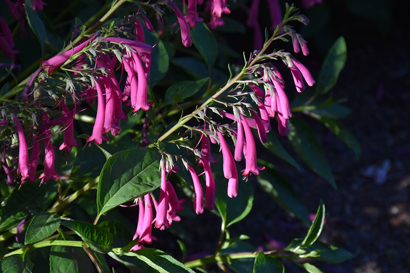 A striking variety featuring vivid magenta trumpet flowers on deep ruby stems, over mounded green foliage; very attractive to hummingbirds; a dense self supporting round sub-shrub that can be treated as a tender perennial in colder areas