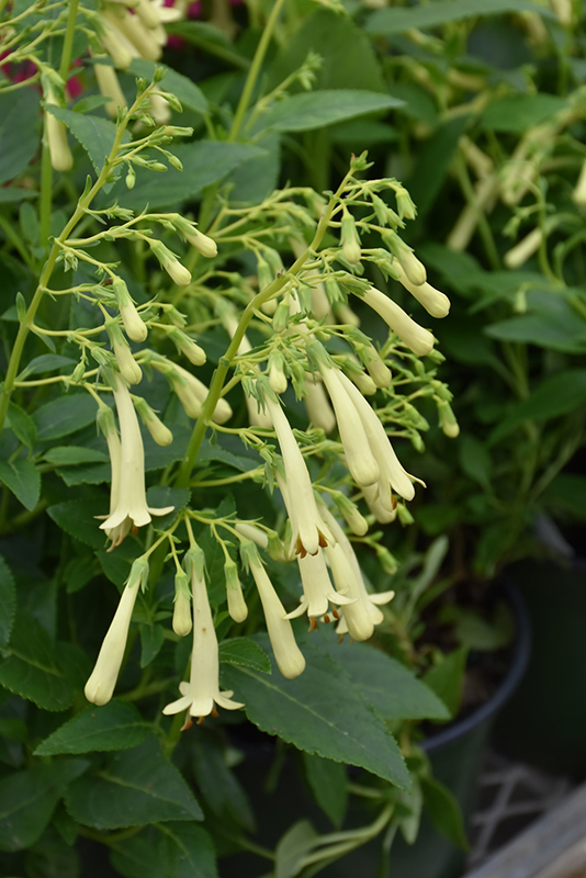 A striking variety featuring nodding pale yellow flowers above contrasting dark green foliage; very attractive to hummingbirds; a dense self supporting round shrub that can be treated as a tender perennial in colder areas