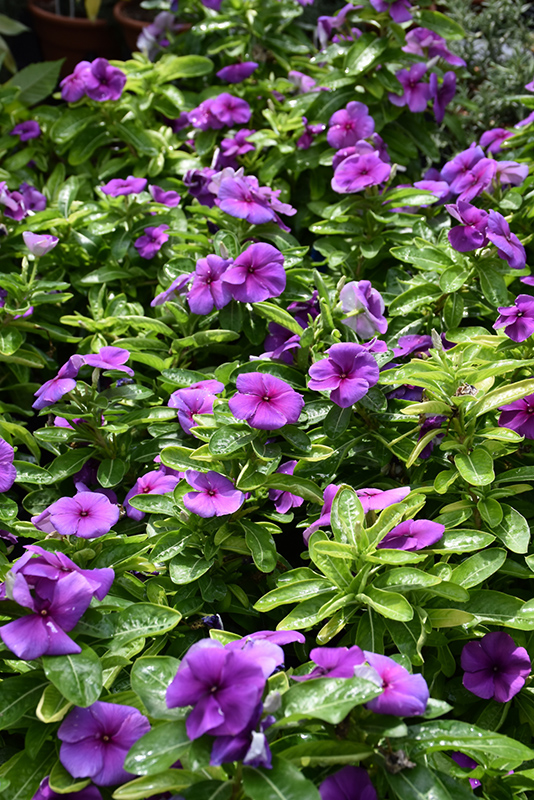 Jams 'N Jellies™ Blueberry Vinca features showy violet star-shaped flowers with blue overtones and white eyes at the ends of the stems from late spring to mid fall. Its glossy oval leaves remain dark green in colour throughout the year.