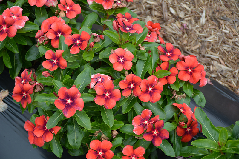 Tattoo™ Tangerine Vinca will grow to be about 12 inches tall at maturity, with a spread of 8 inches. When grown in masses or used as a bedding plant, individual plants should be spaced approximately 6 inches apart. Its foliage tends to remain dense right to the ground, not requiring facer plants in front. Although it's not a true annual, this fast-growing plant can be expected to behave as an annual in our climate if left outdoors over the winter, usually needing replacement the following year. As such, gardeners should take into consideration that it will perform differently than it would in its native habitat.