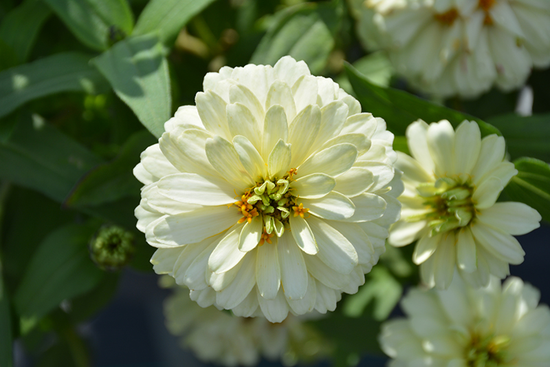Zahara® Double White Zinnia features bold double white pincushion flowers with buttery yellow eyes at the ends of the stems from mid spring to late summer. The flowers are excellent for cutting. Its pointy leaves remain green in colour throughout the season.