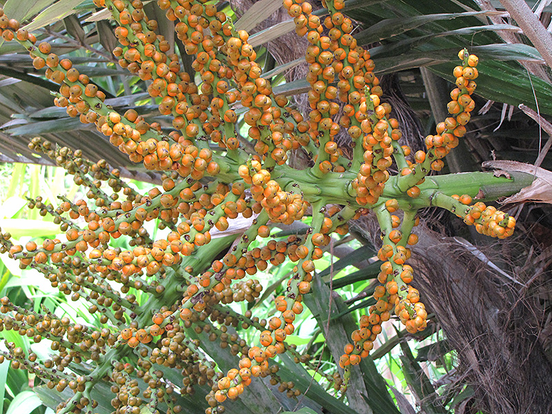 Formosa Palm features showy spikes of fragrant orange flowers with red overtones held atop the branches from late winter to early spring. It has attractive dark green foliage with silver undersides. The twisted narrow pinnately compound leaves are highly ornamental and remain dark green throughout the winter. The red fruits with deep purple variegation and which fade to brown over time are held in clusters from early to late summer.