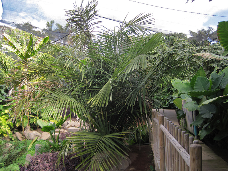 A dwarf clustering palm that is dense and compact; long, narrow leaflets are green above and silver blue underneath; green ringed trunks are covered in coarse fibers; an impressive landscape accent