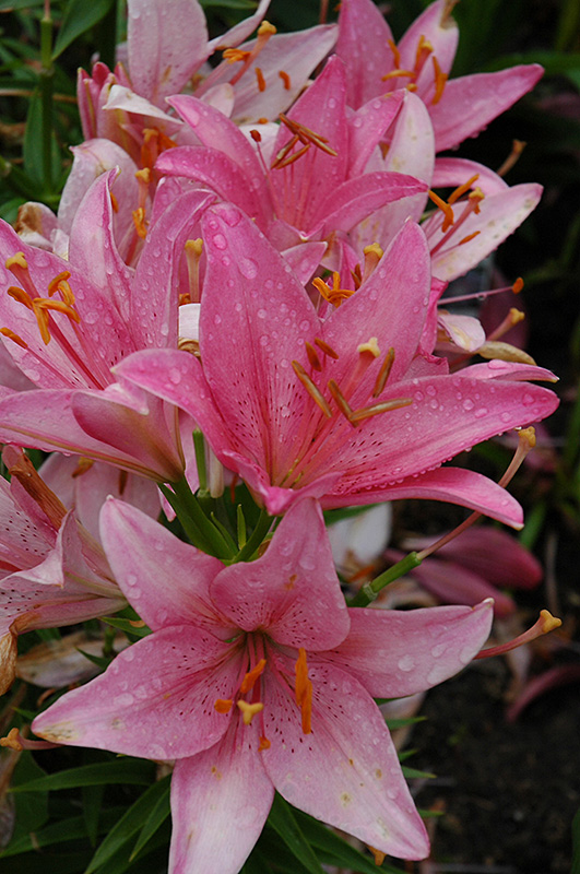 Grand Love Lily will grow to be about 30 inches tall at maturity, with a spread of 18 inches. When grown in masses or used as a bedding plant, individual plants should be spaced approximately 14 inches apart. It tends to be leggy, with a typical clearance of 1 foot from the ground, and should be underplanted with lower-growing perennials. It grows at a fast rate, and under ideal conditions can be expected to live for approximately 10 years. As an herbaceous perennial, this plant will usually die back to the crown each winter, and will regrow from the base each spring. Be careful not to disturb the crown in late winter when it may not be readily seen!