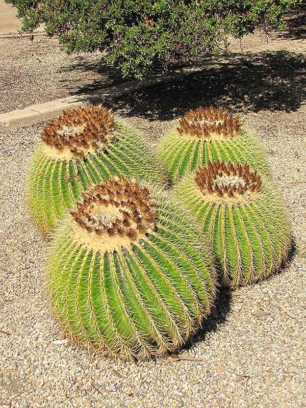 Golden Barrel Cactus is a member of the cactus family, which are grown primarily for their characteristic shapes, their interesting features and textures, and their high tolerance for hot, dry growing environments. Like all cacti, it doesn't actually have leaves, but rather modified succulent stems that comprise the bulk of the plant, and which are designed to hold water for long periods of time. This particular cactus is valued for its distinctive barrel shape, and usually grows as a single spiny ribbed green stem. This plant has yellow cup-shaped flowers held atop the stems from late spring to early summer, which are interesting on close inspection.