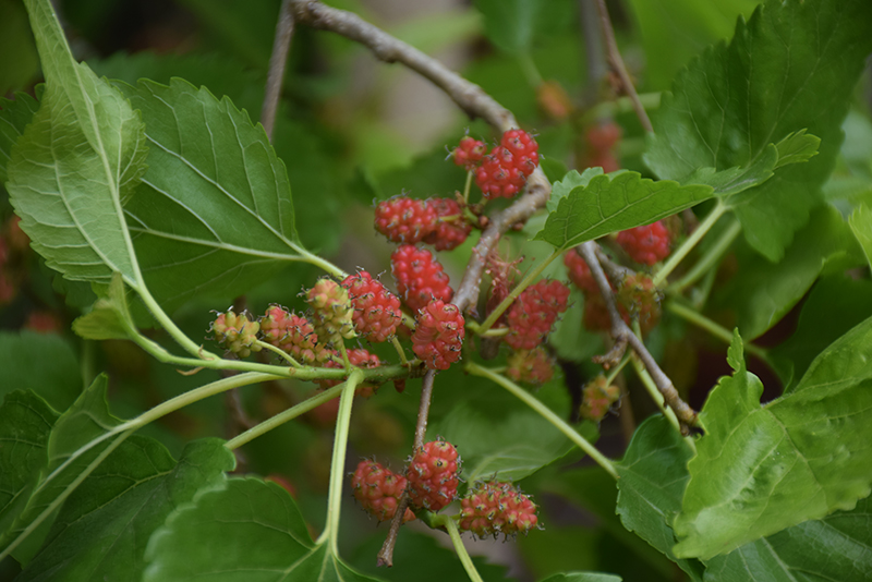 Common Mulberry has rich green deciduous foliage on a tree with a round habit of growth. The large pointy leaves turn yellow in fall. The red fruits are held in clusters in mid summer. The fruit can be messy if allowed to drop on the lawn or walkways, and may require occasional clean-up.