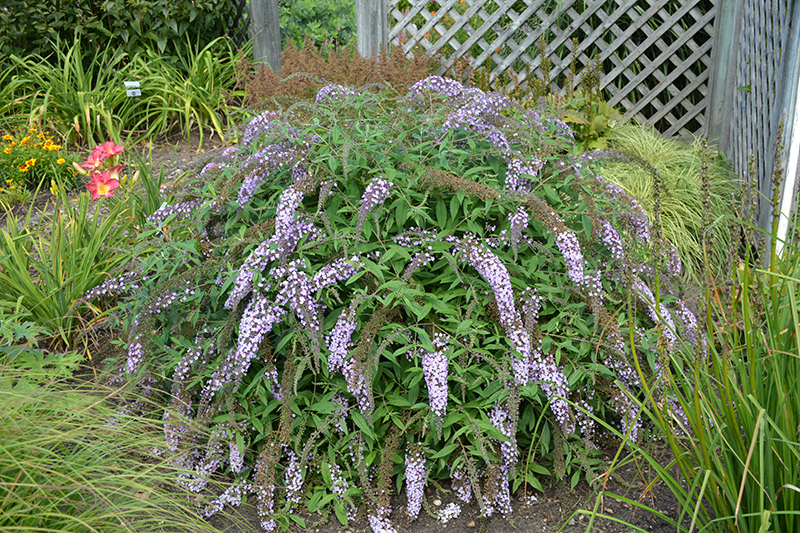 A compact garden plant with large, arching soft lavender-purple flower spikes in summer that cascade down the habit; attracts butterflies; may treat as a perennial and cut it back to the ground each spring as it regrows vigorously and blooms on new wood
