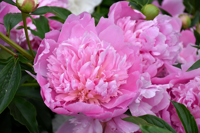 Heidi Peony features bold lightly-scented double hot pink flowers with coral-pink eyes at the ends of the stems in late spring. The flowers are excellent for cutting. Its compound leaves remain dark green in colour throughout the season.