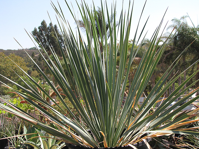 A succulent cactus-like shrub with beautiful gray-blue spear-like leaves radiating from an upright stem; tall spikes of nodding white flowers in spring on mature plants; once established, this variety is trunk forming; good for dry, alkaline sites