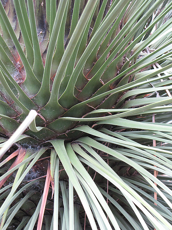 This stunning plant bears extremely narrow blue-green leaves that radiate symmetrically from a large woody trunk that forms over time; tall spikes of white flowers from reddish buds; good for hot, dry sites; great for borders, patios and containers
