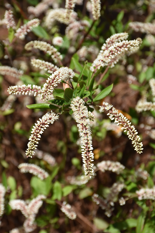 Sarah Eve Virginia Sweetspire is draped in stunning racemes of fragrant white flowers with pink overtones at the ends of the branches in early summer. It has dark green foliage with hints of purple. The narrow leaves turn outstanding shades of burgundy, orange and gold in the fall. The smooth brown bark and dark red branches add an interesting dimension to the landscape.