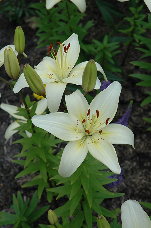 Roma Lily features bold creamy white trumpet-shaped flowers with light green throats and brown spots at the ends of the stems in early summer. The flowers are excellent for cutting. Its narrow leaves remain green in colour throughout the season.