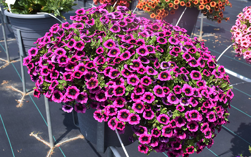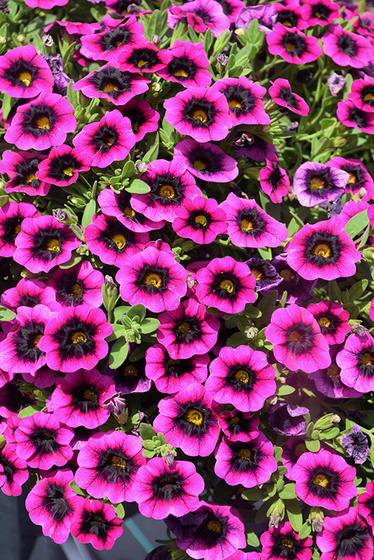 Superbells® Blackcurrent Punch™ Calibrachoa is clothed in stunning fuchsia trumpet-shaped flowers with yellow throats and black centers at the ends of the stems from late spring to mid fall. Its small pointy leaves remain green in colour throughout the season.