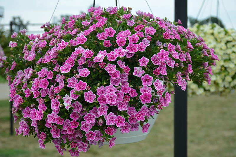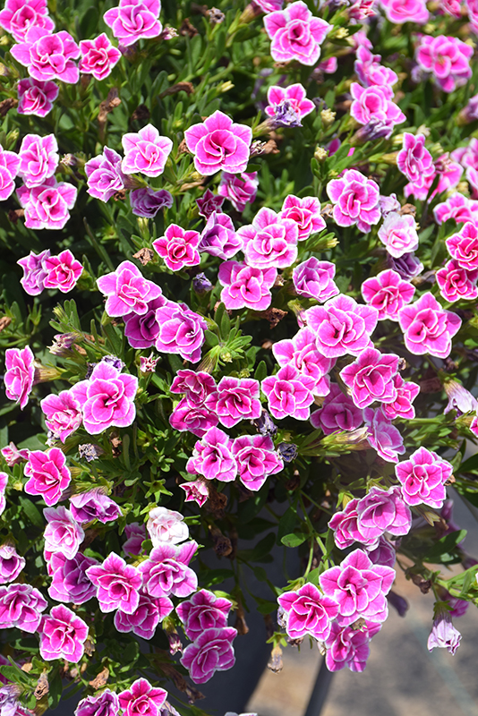 Superbells® Doublette Love Swept™ Calibrachoa is smothered in stunning double hot pink round flowers with white edges at the ends of the stems from late spring to mid fall. Its small pointy leaves remain green in colour throughout the season.