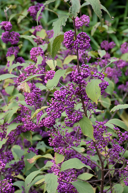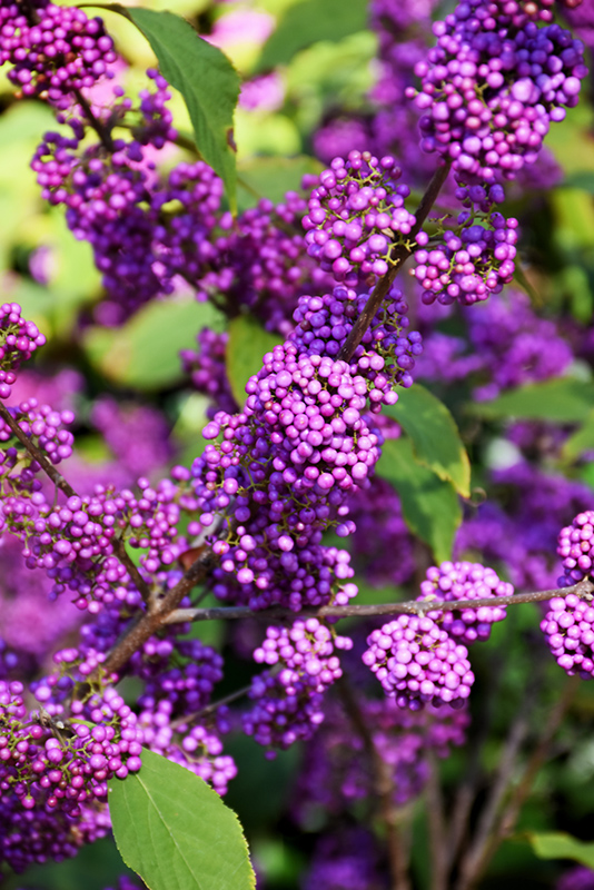 Heavy Berry Japanese Beautyberry is primarily grown for its highly ornamental fruit. It features an abundance of magnificent violet berries with purple overtones from late summer to late fall. It has pink trumpet-shaped flowers along the branches in early summer, which are interesting on close inspection. It has bluish-green deciduous foliage. The pointy leaves do not develop any appreciable fall colour.