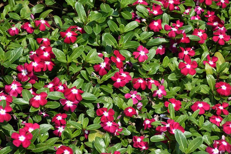 Pacifica Burgundy Halo Vinca will grow to be about 12 inches tall at maturity, with a spread of 8 inches. When grown in masses or used as a bedding plant, individual plants should be spaced approximately 10 inches apart. Its foliage tends to remain dense right to the ground, not requiring facer plants in front. Although it's not a true annual, this fast-growing plant can be expected to behave as an annual in our climate if left outdoors over the winter, usually needing replacement the following year. As such, gardeners should take into consideration that it will perform differently than it would in its native habitat.