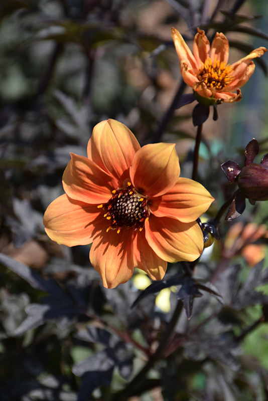 Mystic Spirit Dahlia features showy lightly-scented peach daisy flowers with black eyes and gold anthers at the ends of the stems from mid to late summer. The flowers are excellent for cutting. Its attractive glossy pointy leaves remain black in colour throughout the season.