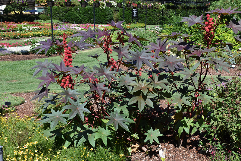 Carmencita Castor Bean will grow to be about 10 feet tall at maturity, with a spread of 6 feet. When grown in masses or used as a bedding plant, individual plants should be spaced approximately 3 feet apart. It has a low canopy with a typical clearance of 1 foot from the ground. Although it's not a true annual, this fast-growing plant can be expected to behave as an annual in our climate if left outdoors over the winter, usually needing replacement the following year. As such, gardeners should take into consideration that it will perform differently than it would in its native habitat.