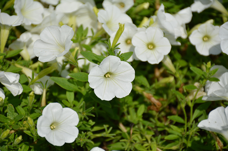 Supertunia® White Charm Petunia is bathed in stunning white trumpet-shaped flowers with yellow throats at the ends of the stems from mid spring to mid fall. Its pointy leaves remain green in colour throughout the season.