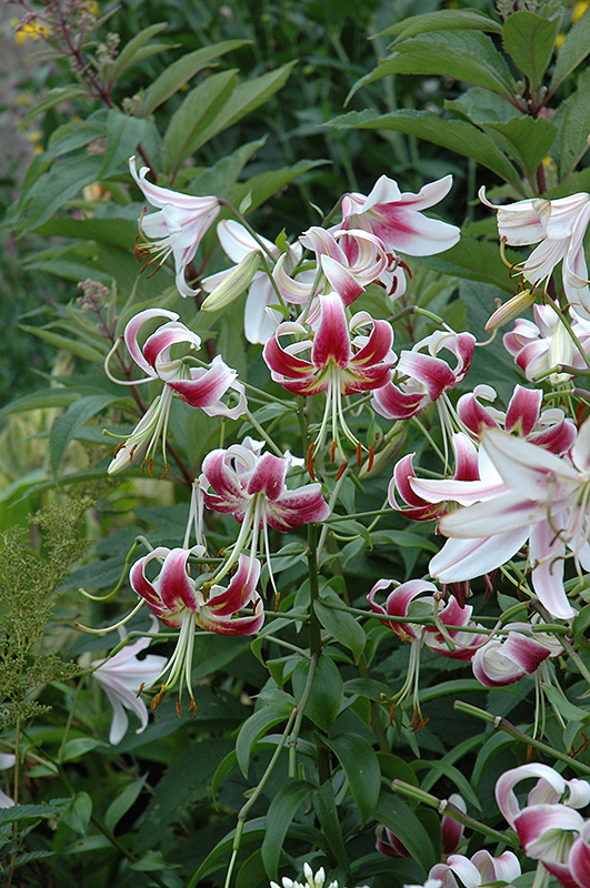 Starburst Sensation Lily features bold nodding crimson trumpet-shaped flowers with yellow throats and white edges at the ends of the stems in mid summer. The flowers are excellent for cutting. Its narrow leaves remain green in colour throughout the season.