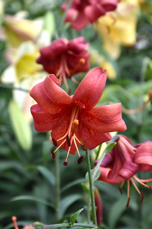 Morden Butterfly Lily features bold nodding cherry red trumpet-shaped flowers with dark red spots at the ends of the stems in mid summer. The flowers are excellent for cutting. Its narrow leaves remain green in colour throughout the season.