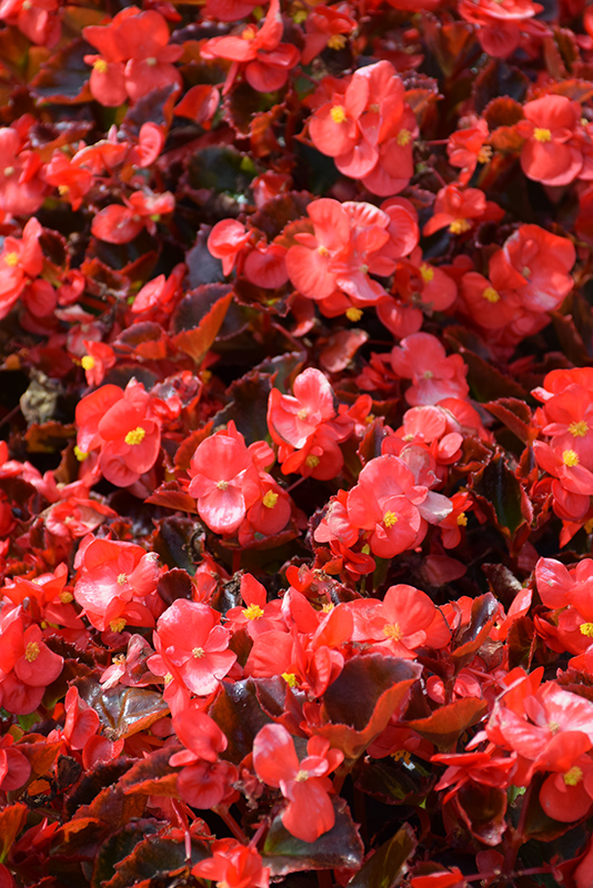 An upright, mounded selection that provides a season-long beauty in landscapes, hanging baskets and containers; features deep bronze foliage with bright scarlet blooms; low maintenance