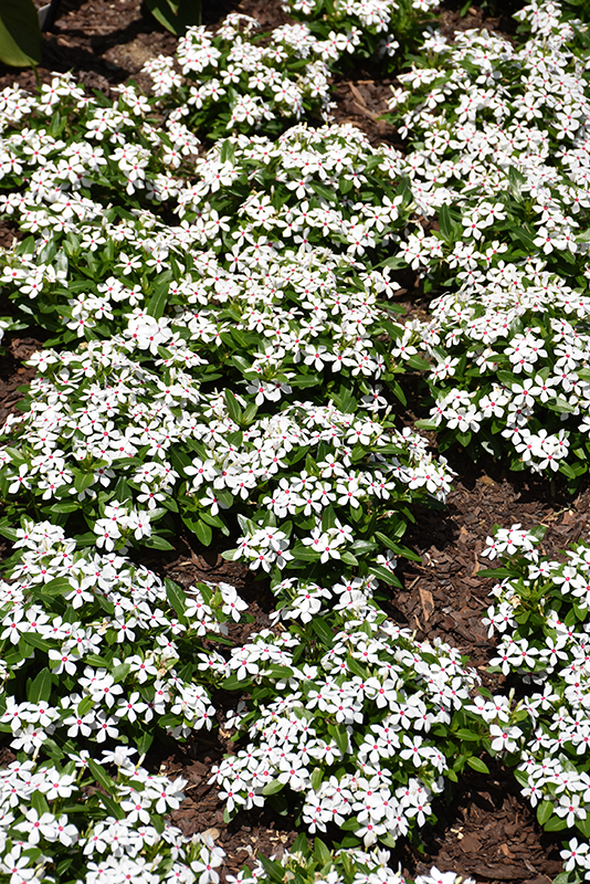 Soiree® Kawaii White Peppermint Vinca features showy white star-shaped flowers with red eyes at the ends of the stems from late spring to mid fall. Its glossy oval leaves remain dark green in colour throughout the year.