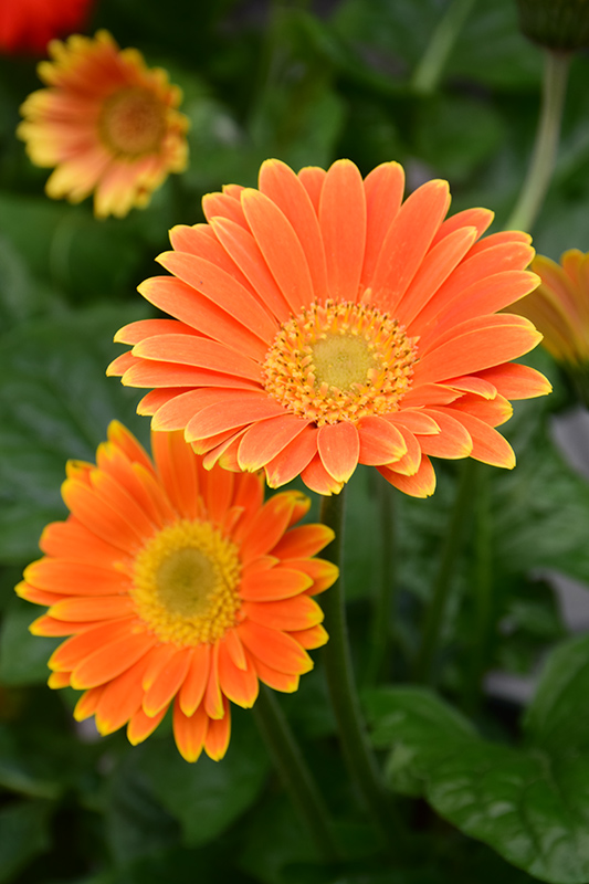 Garvinea® Sweet Caroline Gerbera Daisy features bold semi-double orange daisy flowers with yellow eyes and yellow tips at the ends of the stems from early summer to mid fall. The flowers are excellent for cutting. Its glossy lobed leaves remain green in colour throughout the season.