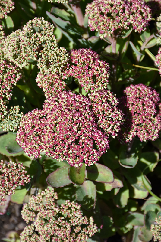 An upright, dense stonecrop presenting large clusters of rose pink flowers held atop rich green succulent foliage and red stems; a drought-tolerant perennial that does best in poor soils; a colorful feature in containers, rock gardens, or as a groundcover