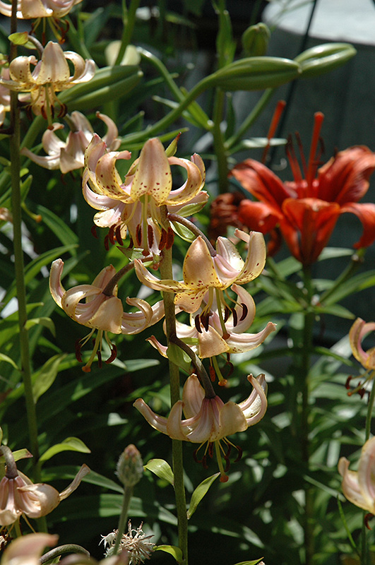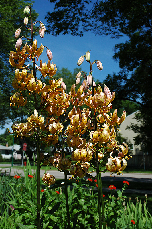 Brocade Martagon Lily will grow to be about 4 feet tall at maturity, with a spread of 24 inches. When grown in masses or used as a bedding plant, individual plants should be spaced approximately 18 inches apart. It tends to be leggy, with a typical clearance of 1 foot from the ground, and should be underplanted with lower-growing perennials. The flower stalks can be weak and so it may require staking in exposed sites or excessively rich soils. It grows at a fast rate, and under ideal conditions can be expected to live for approximately 10 years. As an herbaceous perennial, this plant will usually die back to the crown each winter, and will regrow from the base each spring. Be careful not to disturb the crown in late winter when it may not be readily seen!