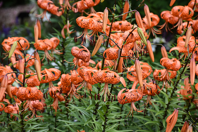 Tiger Lily features bold nodding orange trumpet-shaped flowers with black spots at the ends of the stems in mid summer. The flowers are excellent for cutting. Its narrow leaves remain green in colour throughout the season.