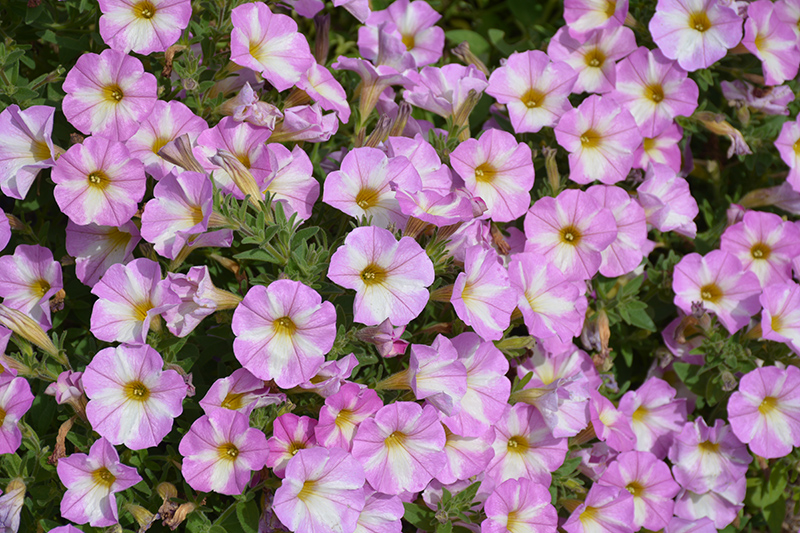 SuperCal® Lavender Star Petchoa is blanketed in stunning lavender trumpet-shaped flowers with gold throats and white stripes at the ends of the stems from mid spring to late summer. Its pointy leaves remain green in colour throughout the season.