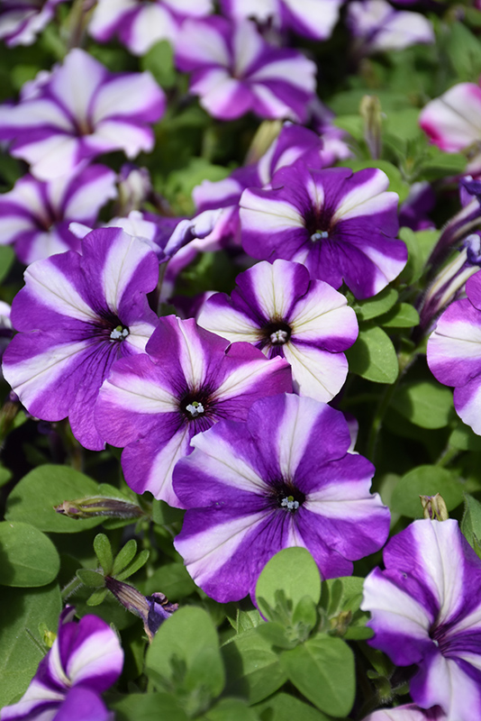 Headliner™ Blueberry Swirl Petunia is bathed in stunning purple trumpet-shaped flowers with white stripes at the ends of the stems from mid spring to early fall. Its pointy leaves remain green in colour throughout the season.