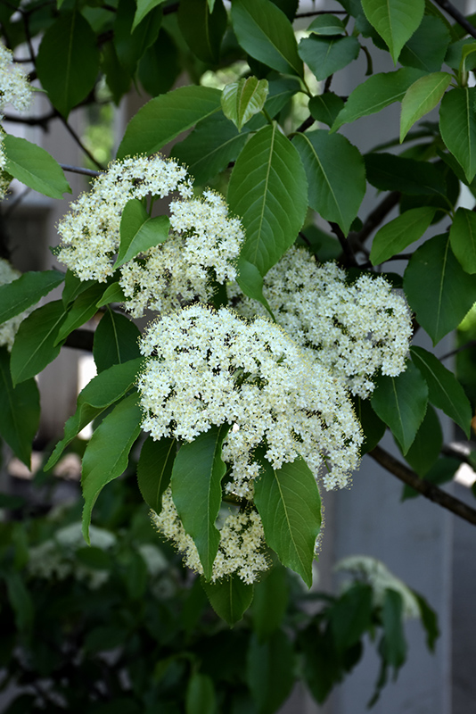 An improved selection of the classic native shrub; large clusters of creamy white flowers in spring, showy blue fruit in fall and reliable fall color; has an upright spreading habit; hardy and adaptable with excellent powdery mildew resistance