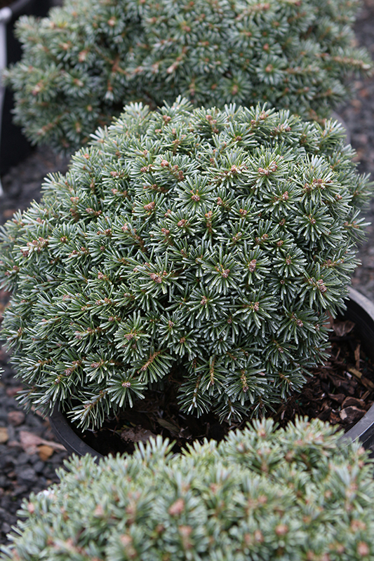 A dense rounded miniature selection with an unusual shade of gray-green needles on short stems; forms a tight, uniform, globe-shaped habit; great as an accent for the rock garden or along border fronts