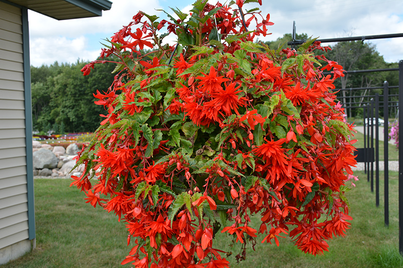 A vigorous trailing begonia with pointed, deep green shiny leaves; bright orange double blooms are produced throughout the season; grows well in humid conditions; great spiller for containers, or hanging baskets