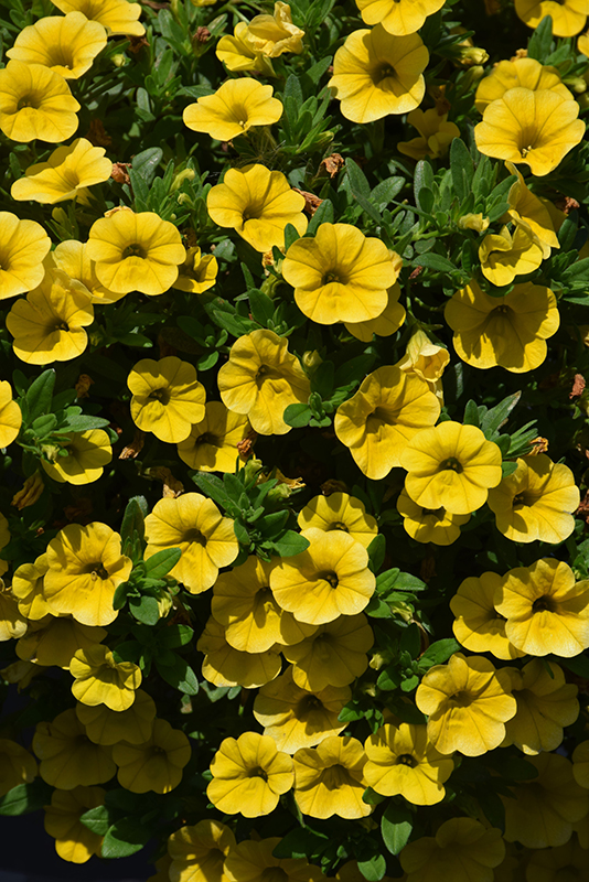 Lia™ Yellow Calibrachoa is blanketed in stunning yellow trumpet-shaped flowers with gold throats at the ends of the stems from late spring to early fall. Its small pointy leaves remain green in colour throughout the season.