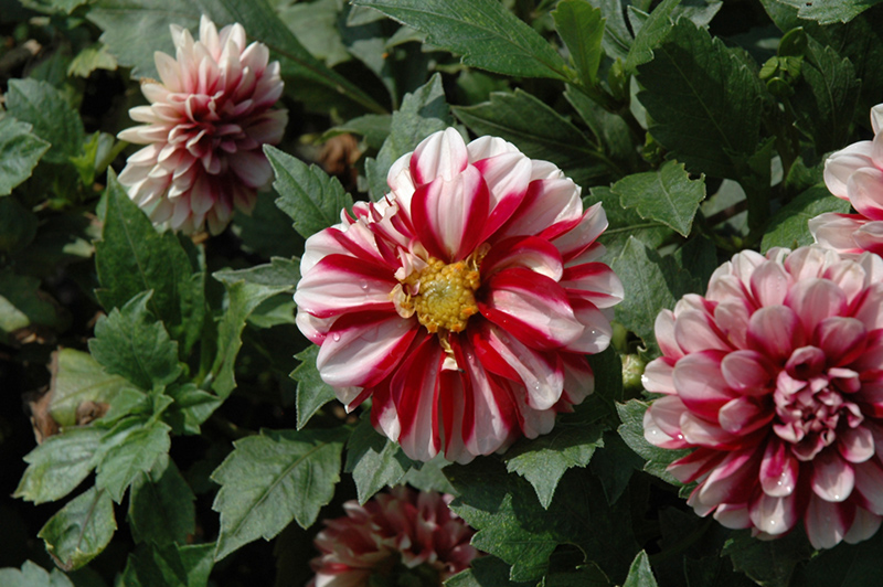 Dalaya® Dark Red and White Dahlia will grow to be about 14 inches tall at maturity, with a spread of 14 inches. When grown in masses or used as a bedding plant, individual plants should be spaced approximately 12 inches apart. Its foliage tends to remain dense right to the ground, not requiring facer plants in front. Although it's not a true annual, this plant can be expected to behave as an annual in our climate if left outdoors over the winter, usually needing replacement the following year. As such, gardeners should take into consideration that it will perform differently than it would in its native habitat.