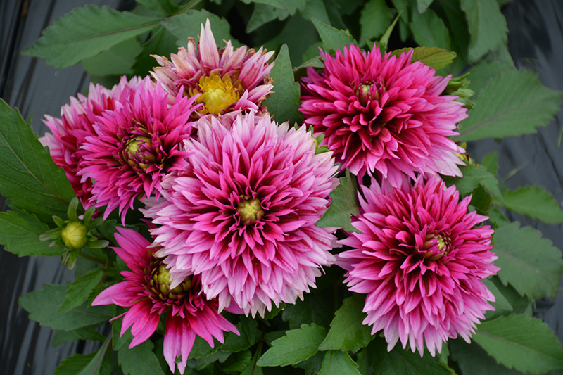 Labella® Maggiore Deep Rose Dahlia features showy double rose daisy flowers with shell pink overtones and yellow eyes at the ends of the stems from mid summer to mid fall. The flowers are excellent for cutting. Its serrated pointy leaves remain green in colour throughout the season.