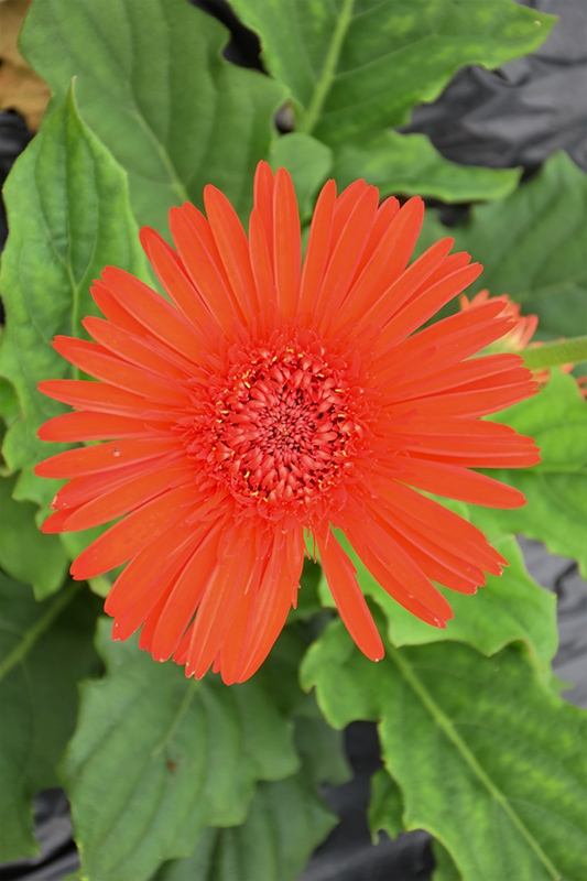 Cartwheel® Glowing Ember Gerbera Daisy features bold semi-double red daisy flowers with scarlet overtones and gold anthers at the ends of the stems from mid spring to mid fall. The flowers are excellent for cutting. Its tomentose oval leaves remain bluish-green in colour throughout the season.