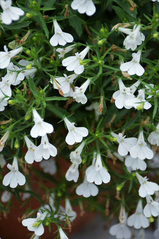 Hot® Igloo Lobelia features dainty white flowers at the ends of the stems from early spring to early fall. Its tiny narrow leaves remain green in colour throughout the season.