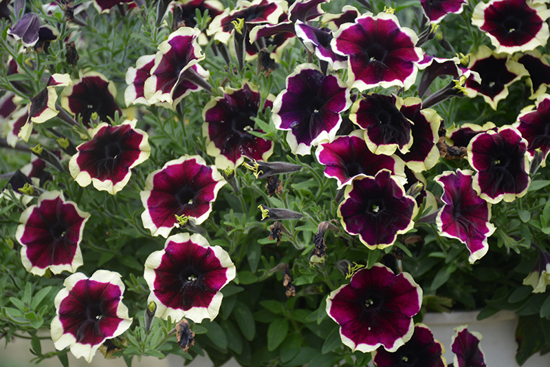 Crazytunia® Good Night Kisses Petunia is bathed in stunning plum purple trumpet-shaped flowers with crimson overtones and creamy white edges at the ends of the stems from mid spring to late summer. Its tomentose pointy leaves remain green in colour throughout the season.