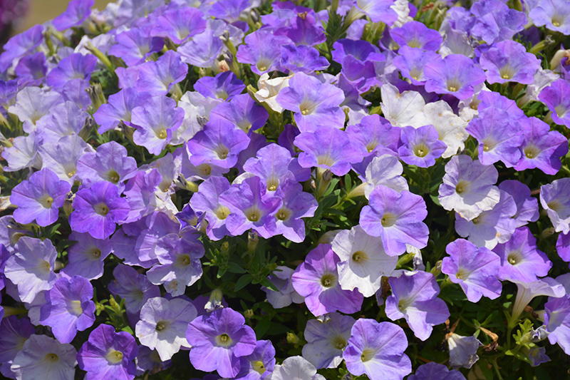 Dekko™ Sky Blue Petunia will grow to be about 12 inches tall at maturity, with a spread of 22 inches. When grown in masses or used as a bedding plant, individual plants should be spaced approximately 18 inches apart. Its foliage tends to remain dense right to the ground, not requiring facer plants in front. This fast-growing annual will normally live for one full growing season, needing replacement the following year.