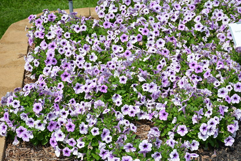 Sanguna® Patio Blue Vein Petunia will grow to be about 10 inches tall at maturity, with a spread of 14 inches. When grown in masses or used as a bedding plant, individual plants should be spaced approximately 10 inches apart. Its foliage tends to remain low and dense right to the ground. This fast-growing annual will normally live for one full growing season, needing replacement the following year.